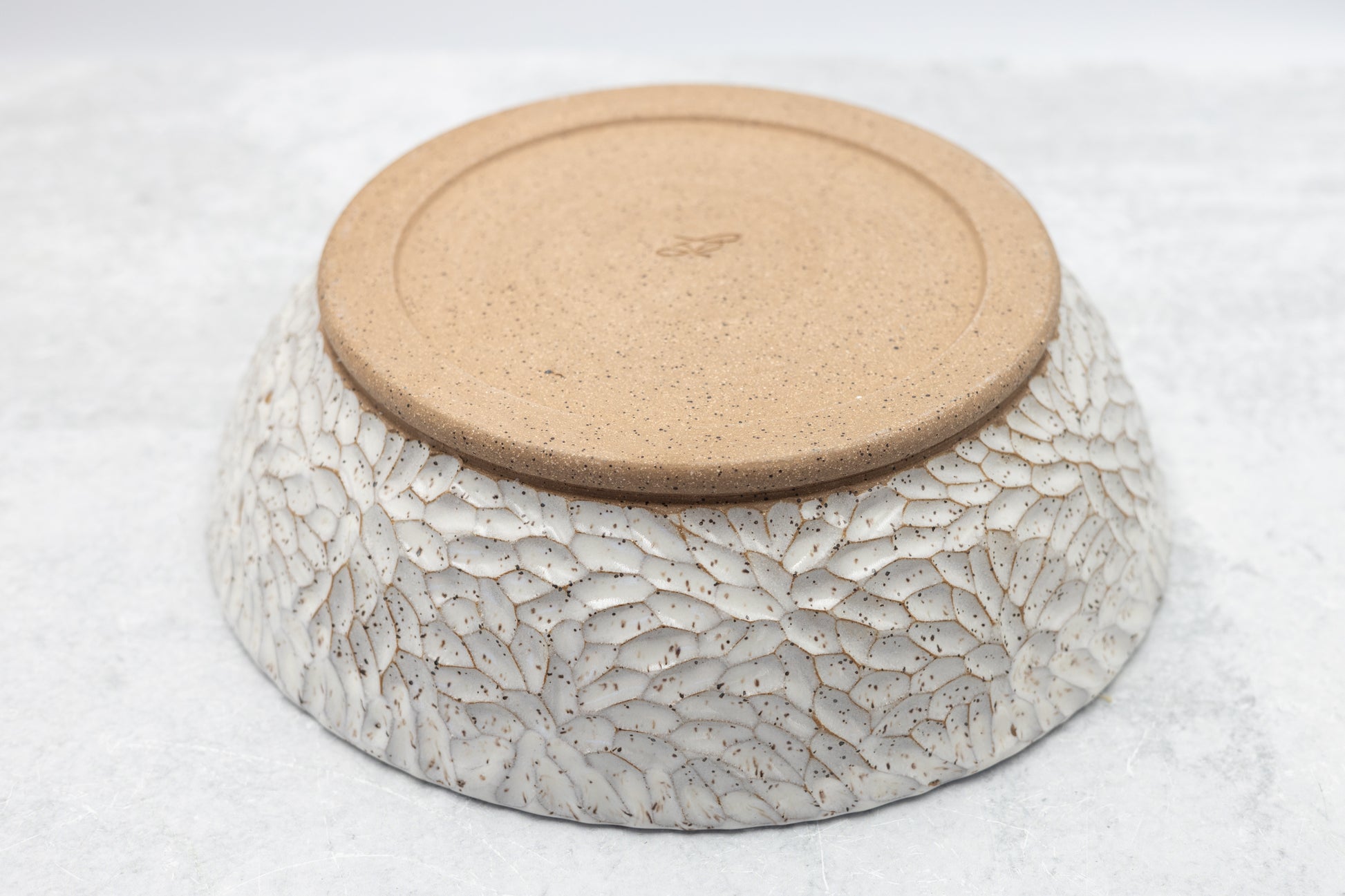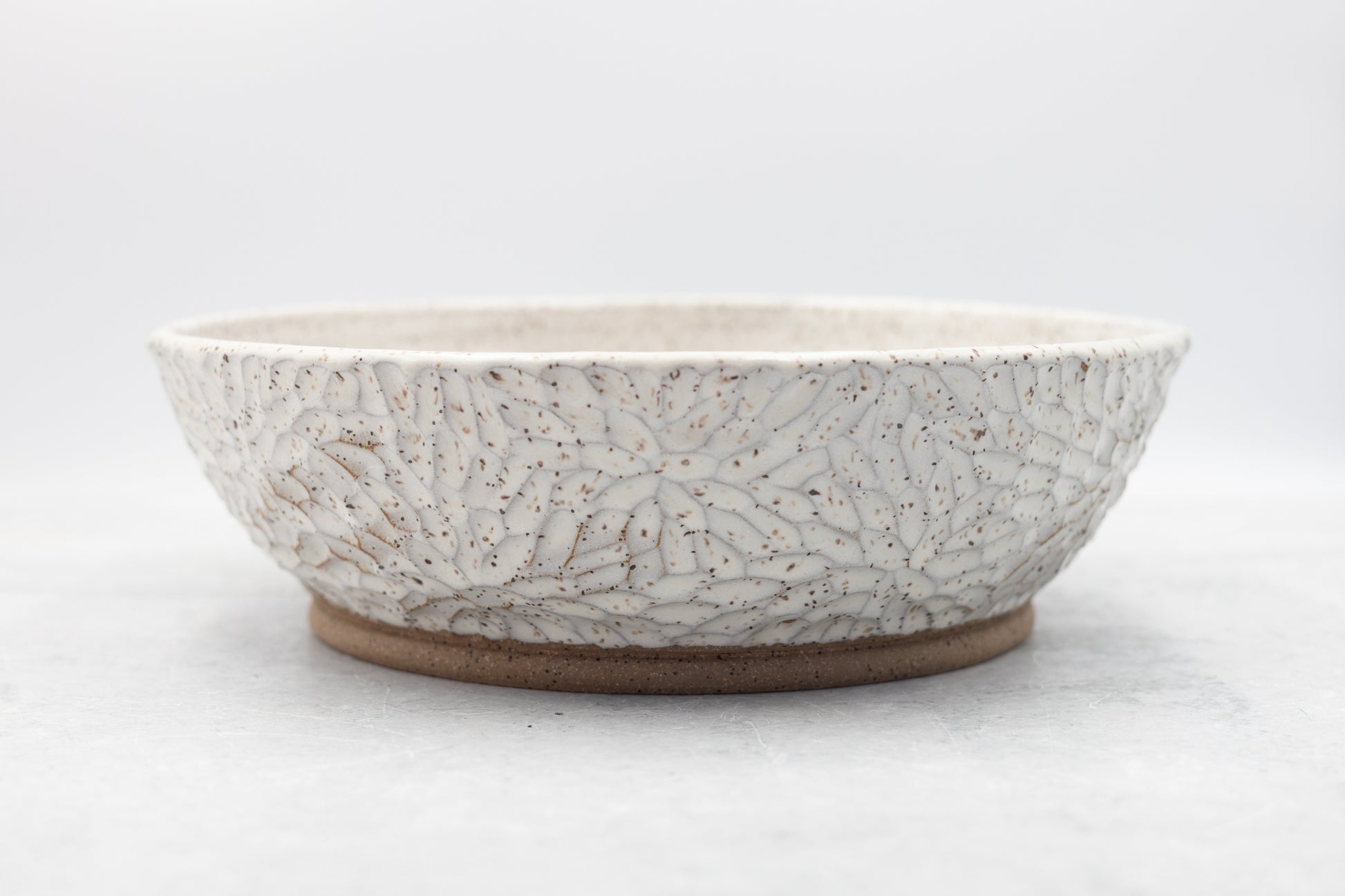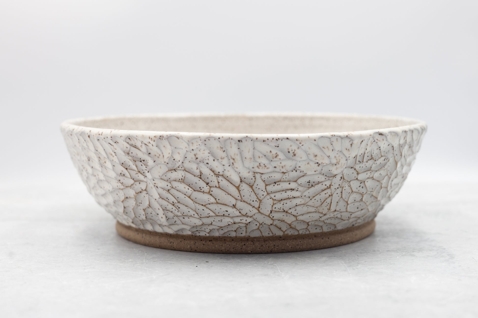 Wheel thrown serving bowl with a warm brown speckled stoneware clay. Hand carved throughout the entire outside. Perfect as a centerpiece on a table or island counter.