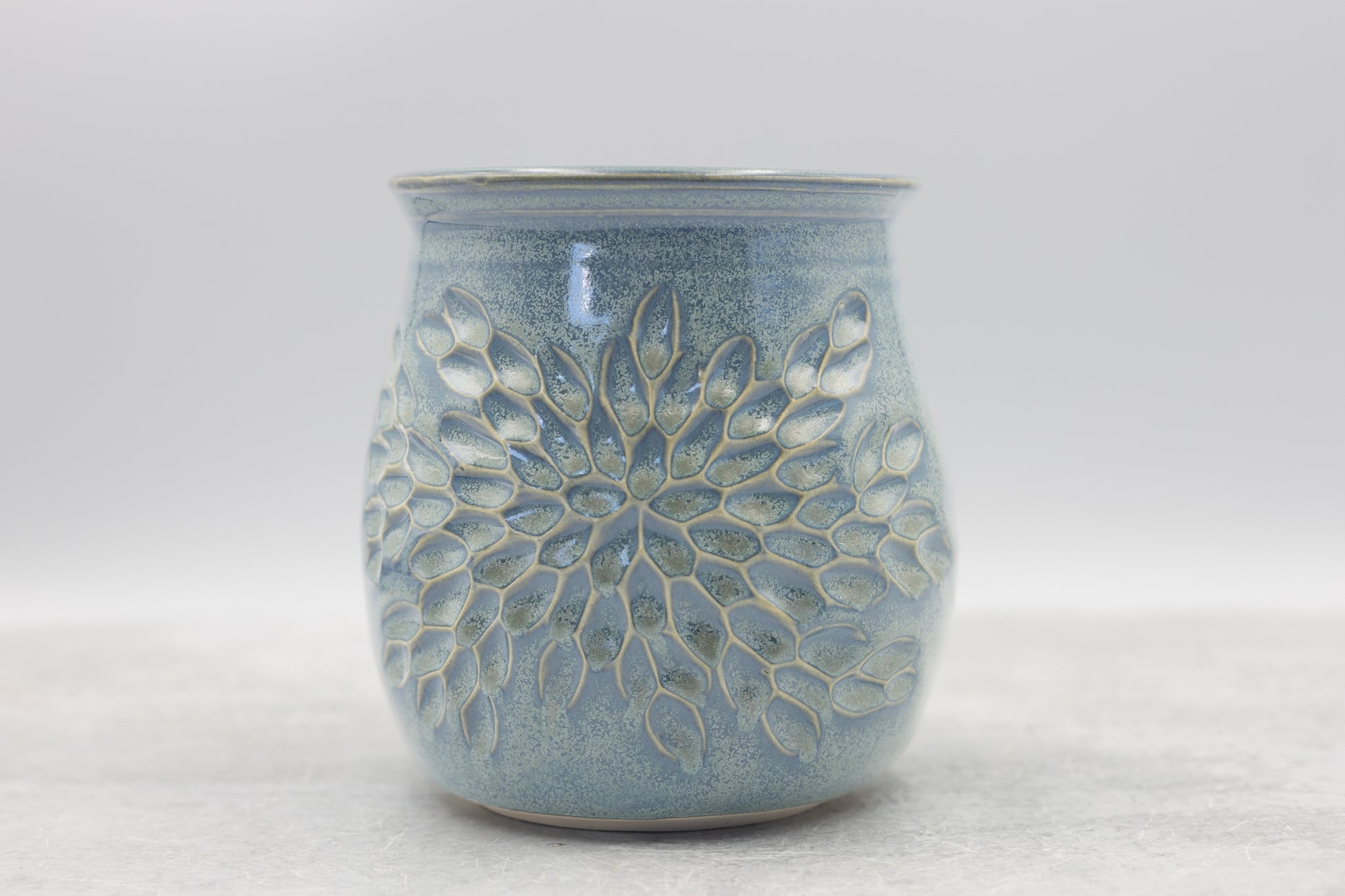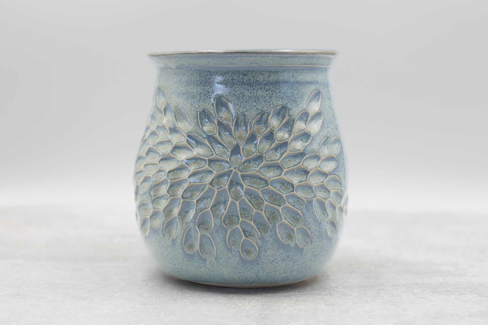 A classically shaped hand thrown vase made with a warm white stoneware clay. Hand carved around all sides and a beautiful floral design.
