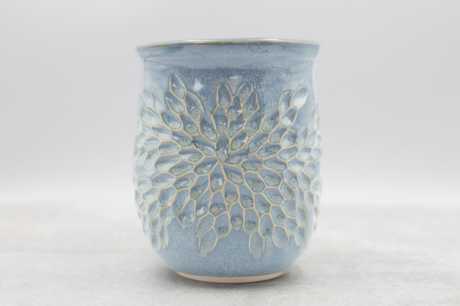 A classically shaped hand thrown vase made with a warm white stoneware clay. Hand carved around all sides and a beautiful floral design.