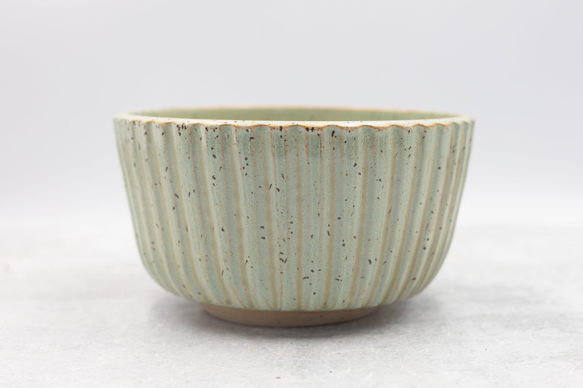 Hand thrown, hand carved serving bowl made with speckled light stoneware clay.